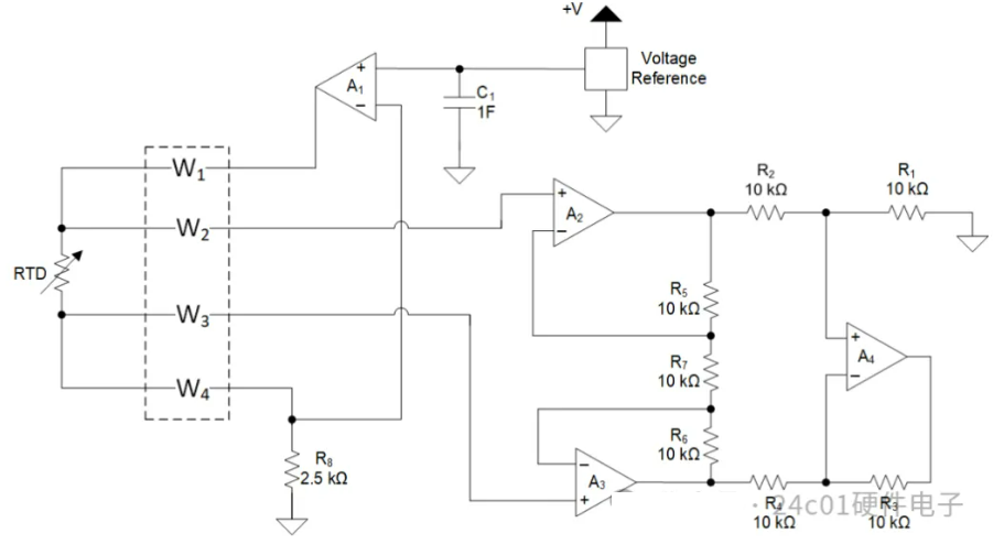 下图电路旨在利用四线 RTD 配置的优势,该配置是精度最高的配置。两条导线 (W1和 W4)是激励电流引线 ,将 RTD 连接到恒流源( A1为恒流源简图,可以是ADC芯片内部的IDAC,或者分立元件搭的恒流源均可 )。另外两条导线 (W2 和 W3)是电压检测引线 ,将 RTD 上的电压连接到放大器(由于 输入阻抗很大,所以基本W2和W3上不存在电流导致的测量误差 )。 A2,A3,A4组成一个仪表运放,输入阻抗大。
