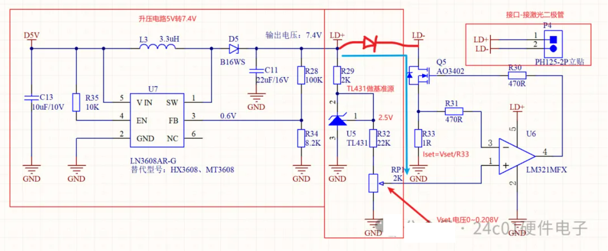 大致电路图如上所示,基本原理就是一个电源电路(buck/boost均可),只要功率和电压满足要求即可;然后再结合一路运放和MOS管构成的恒流源电路,TL431生成基准源加到运放的同相输入端以控制流过激光二极管的电流。Iset=Vset/R33(Vset为基准源分压得到)