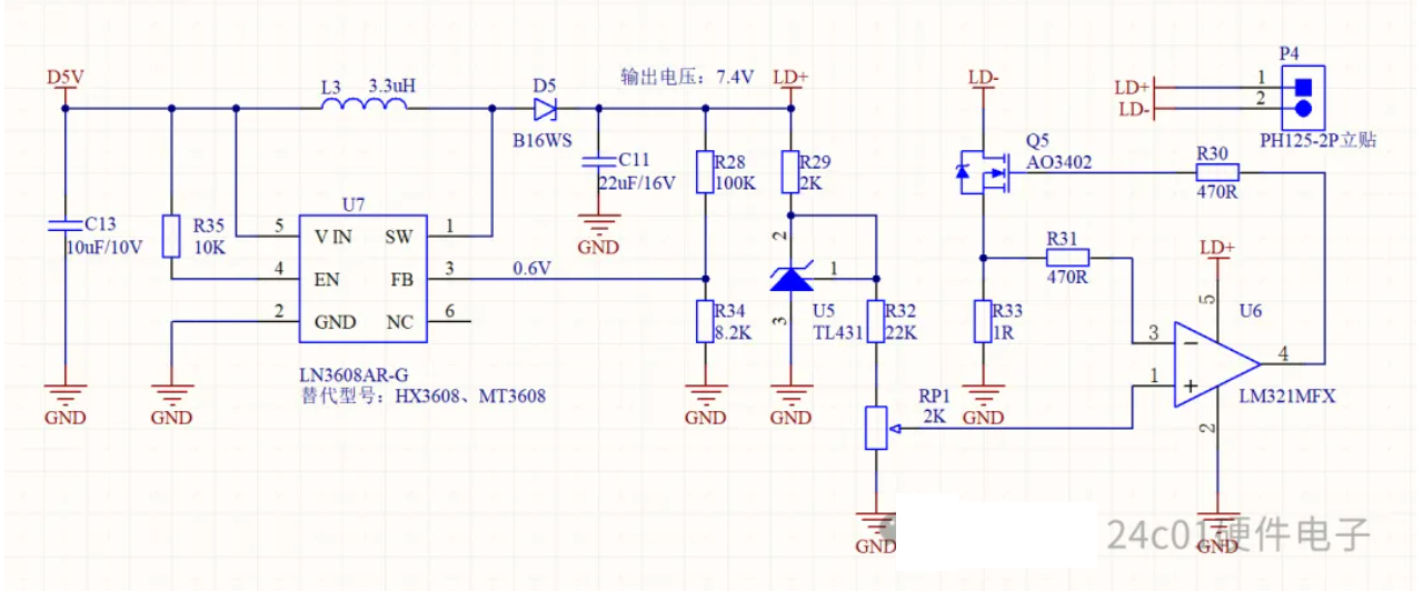 搜了搜一些激光恒流模块也基本就是这种架构的恒流电路,这个电路理论上是没啥问题的。(如下图,某宝某店的激光驱动板)感觉这个电路结构还是蛮常见的,不过不知道大功率的激光驱动电路是怎么样的。