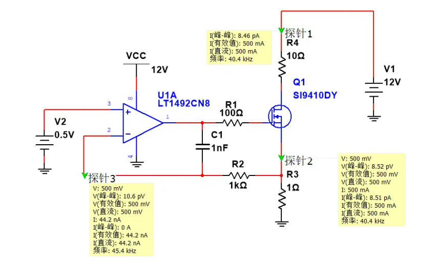那么根据仿真,也可以进一步印证我们的想法。如上推导一样,该电路通过控制同相输入端电压Vp来实现恒流。仿真图中负载电流等于0.5V/1Ω=0.5A。图中 C1作用为在运放上电瞬间建立瞬态的负反馈通路,让运放稳定(因为反馈回路较慢) 。在正常工作后,C1等效为开路。