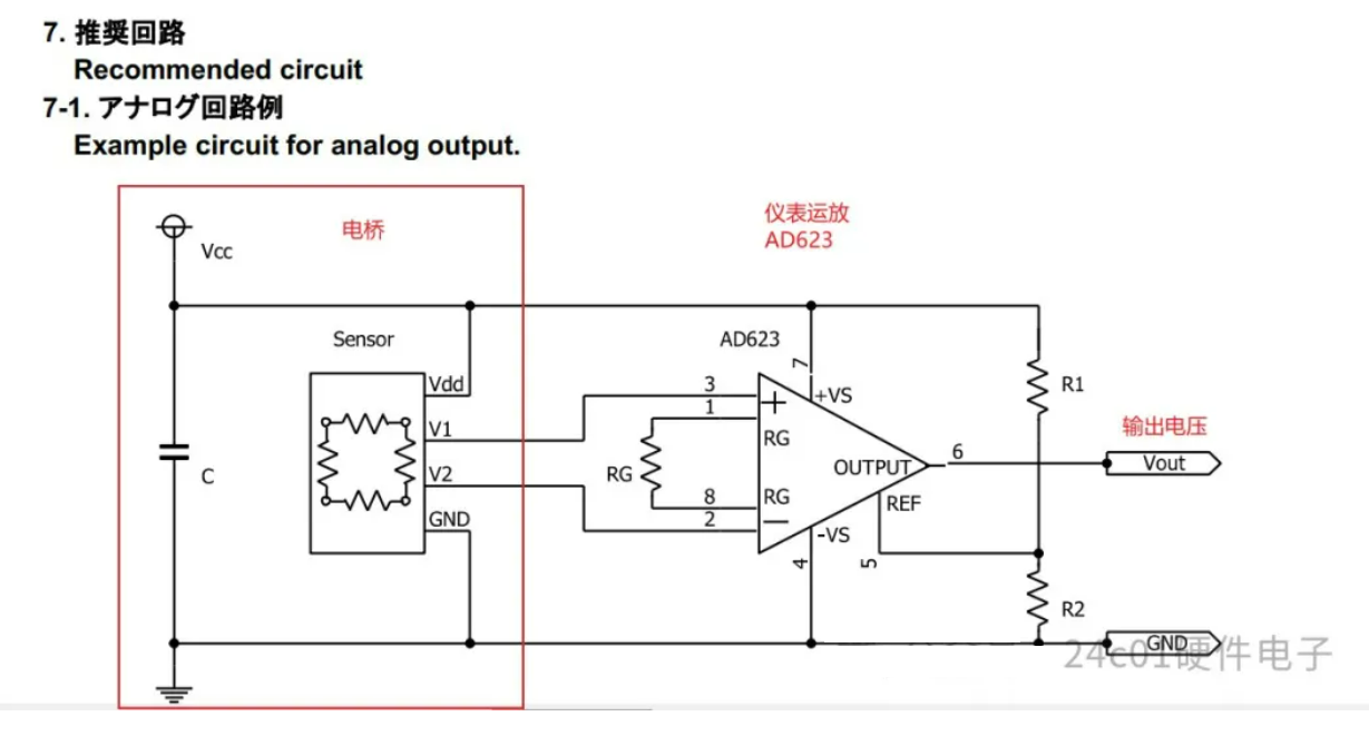 今天看某日本厂家的桥式压力传感器数据手册,发现一处错误,与各位同好做一下分享,同时希望各位同好在看数据手册的时候有所思考,数据手册里的也不完全是对的。下图是桥式压力传感器数据手册里的一个典型应用电路。
