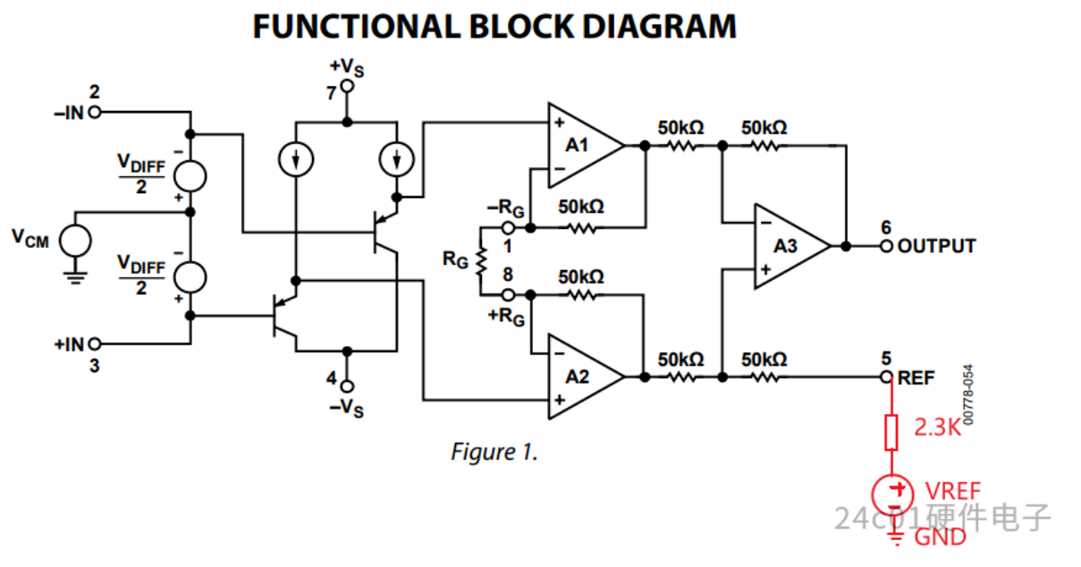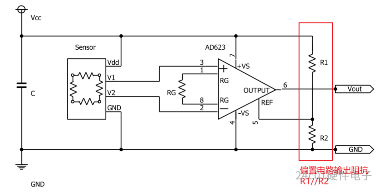 这个公式成立的条件是偏置电路的输出阻抗为0,而如果简简单单使用电阻分压的方法,无疑会引入额外的阻抗,那么这对于仪表运放来说,是不好的。这个电阻分压得到的电路等效如下图(下图为AD623的内部框图),那么很明显偏置电路额外的输出阻抗是会影响最终的输出结果的: