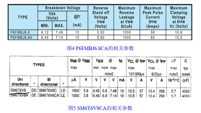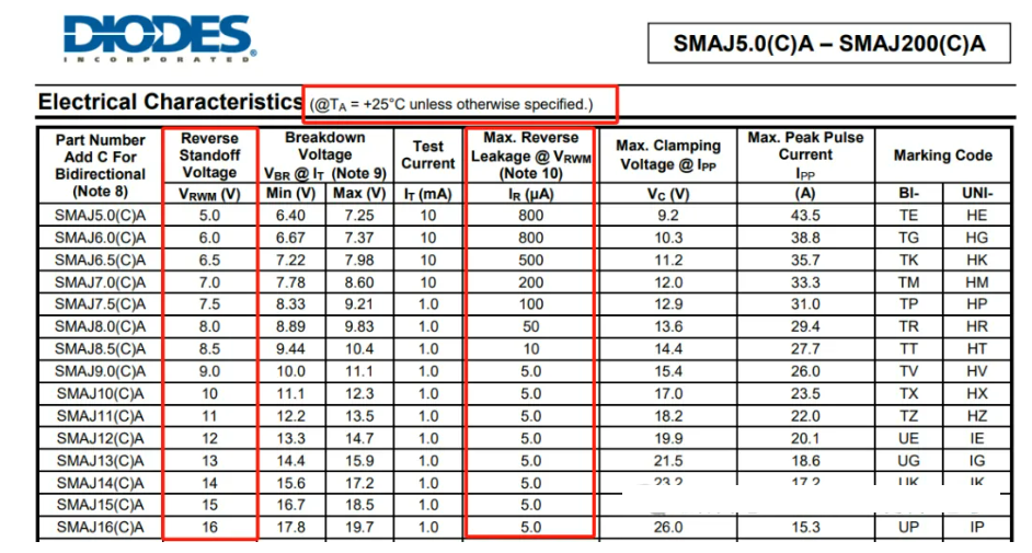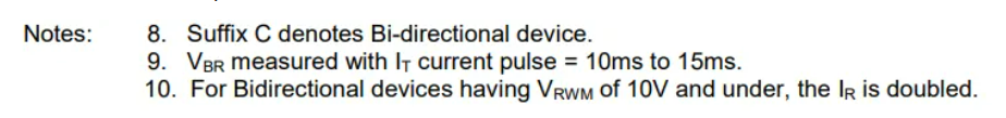 10.低于10V的双向TVS管,漏电流IR翻倍。(例如SMAJ5.0CA,在VRWM下漏电流为800uA*2=1.6mA)