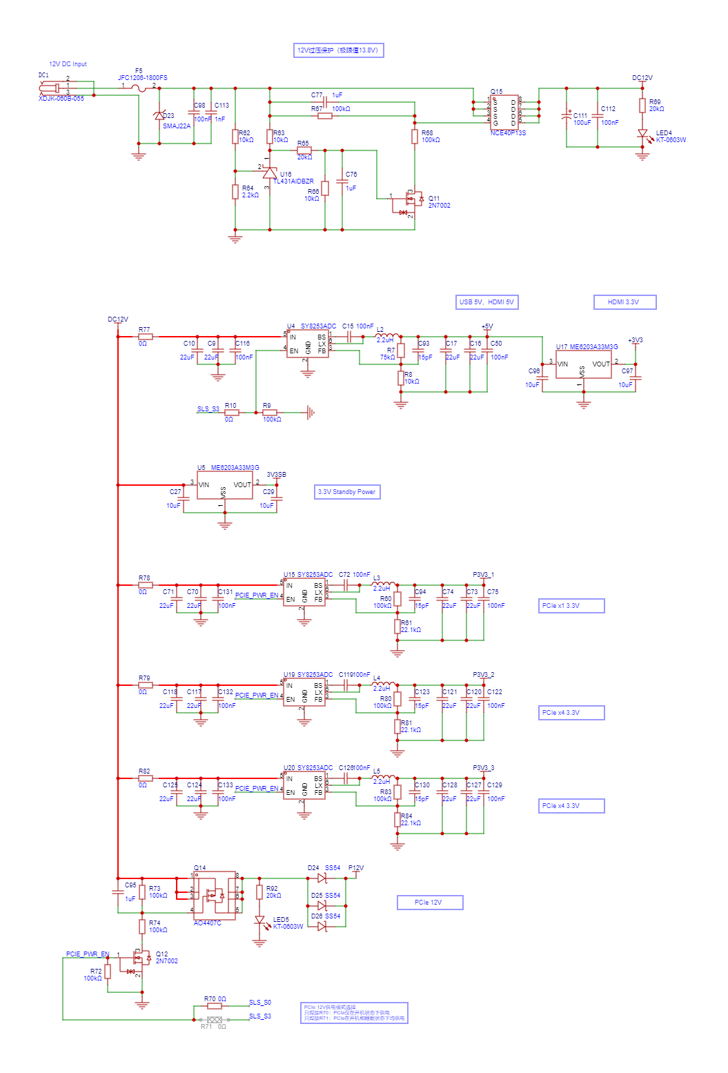 (先通过12V OVP电路,再通过各个降压电路分别得到5V和3.3V电源)