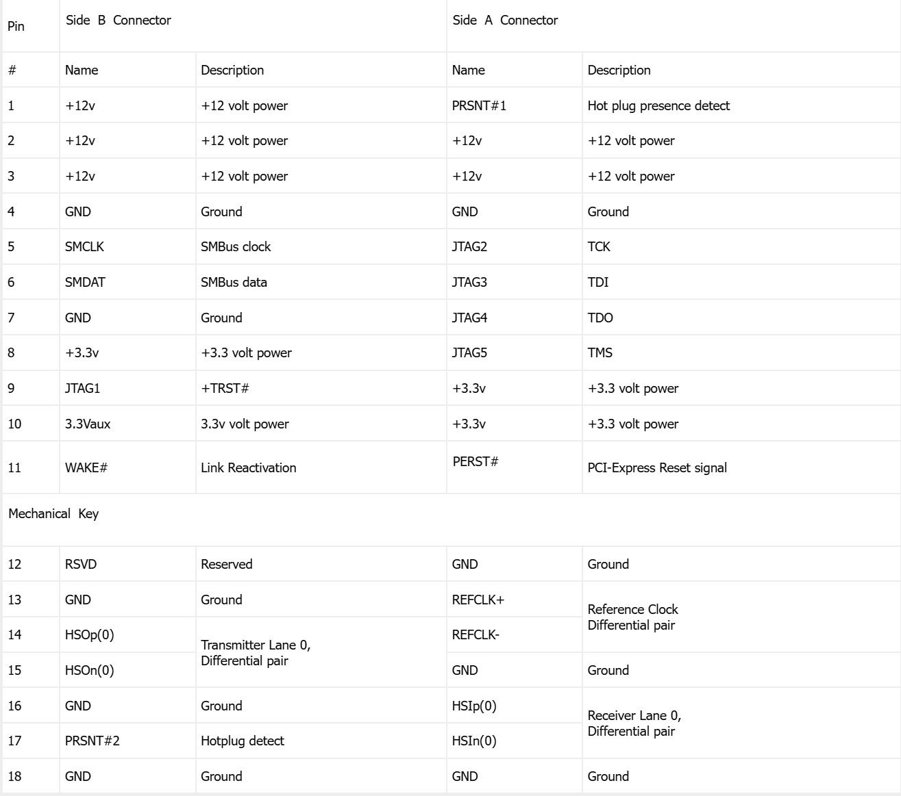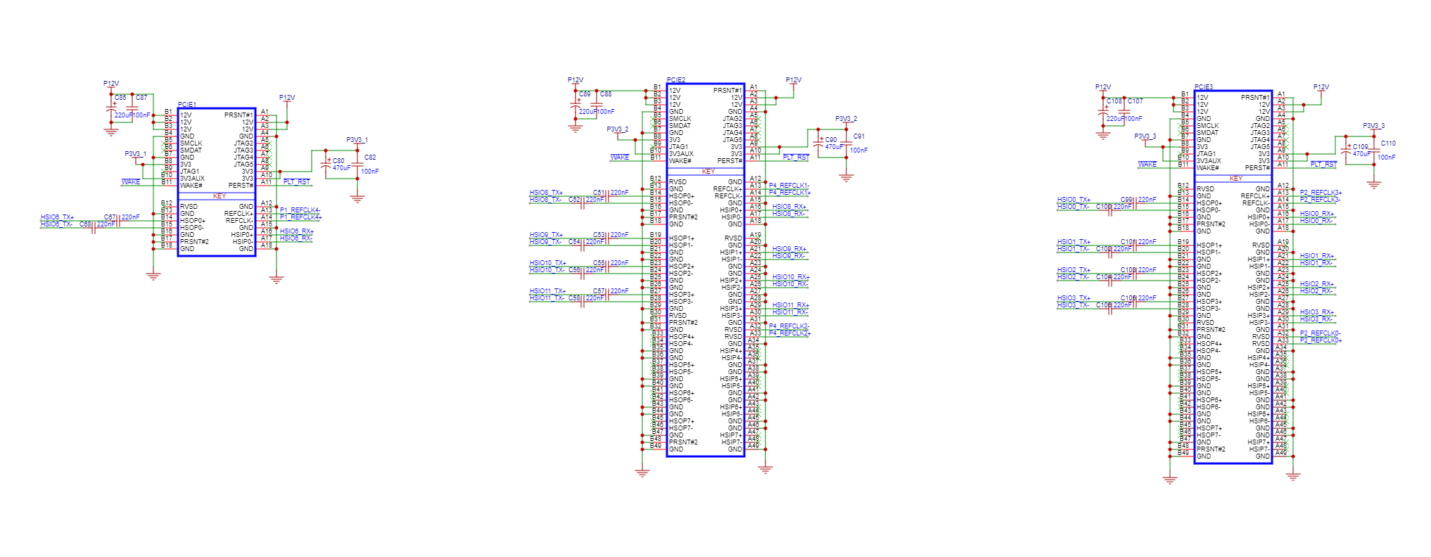 每个PCIe接口,有12V和3.3V电源,PCIe TX差分对和PCIe RX差分对,REFCLK差分对时钟信号,还有WAKE、RST信号。