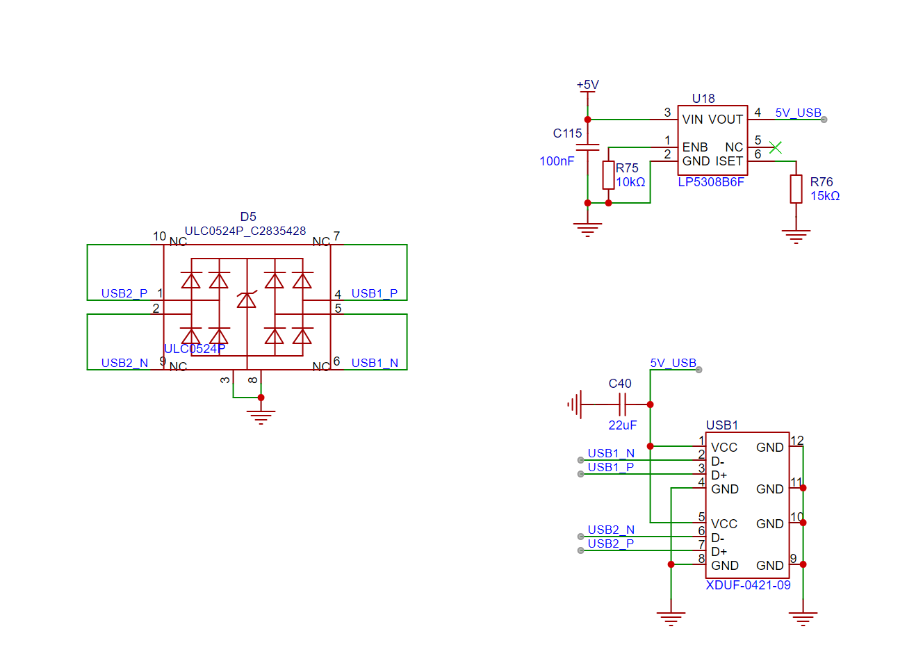 官方参考设计电路中,USB部分使用的是自恢复保险丝,但是自恢复保险丝无法精准限流,且响应时间慢,因此我改用LP5308B6F芯片。该芯片具有5.85V过压保护和可调限流保护(最大2.5A)功能。