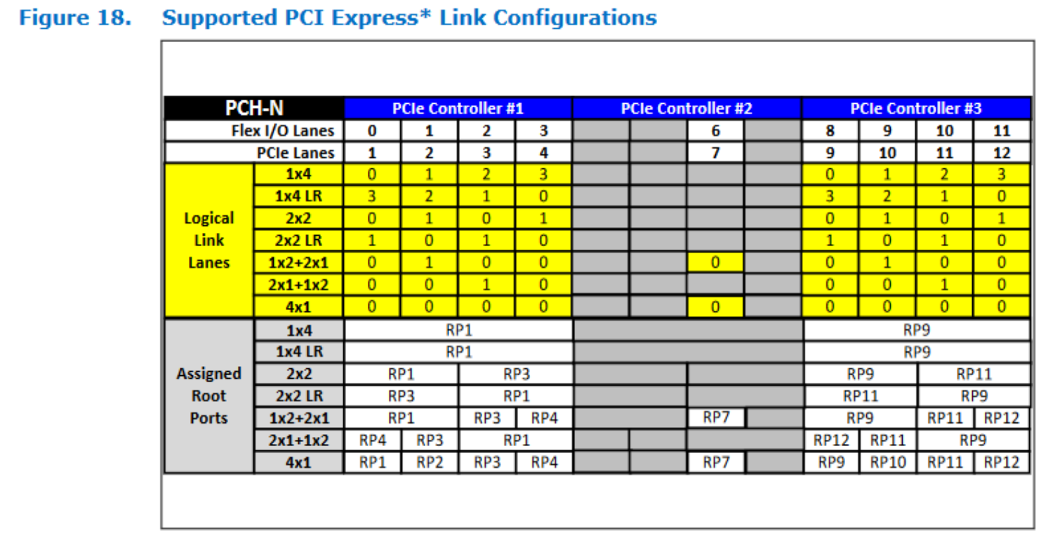 根据Intel给的Flexible IO Lanes分配表,要实现2个PCIe x4和1个PCIe x1的配置,HSIO的分配是: