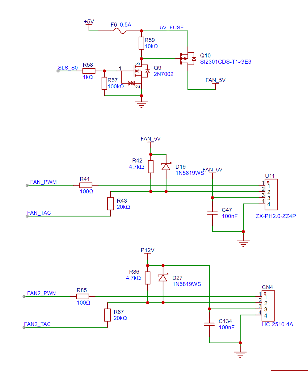 一个是给LattePanda Mu风扇专用的,5V供电,支持调速。实际测试中发现,在睡眠状态下,风扇转速会出现不可控,不知道官方会不会修复这个问题。我直接使用PMOS管,对风扇的5V电源开关控制,在睡眠状态下关闭供电,从而避免风扇转速不可控的问题。