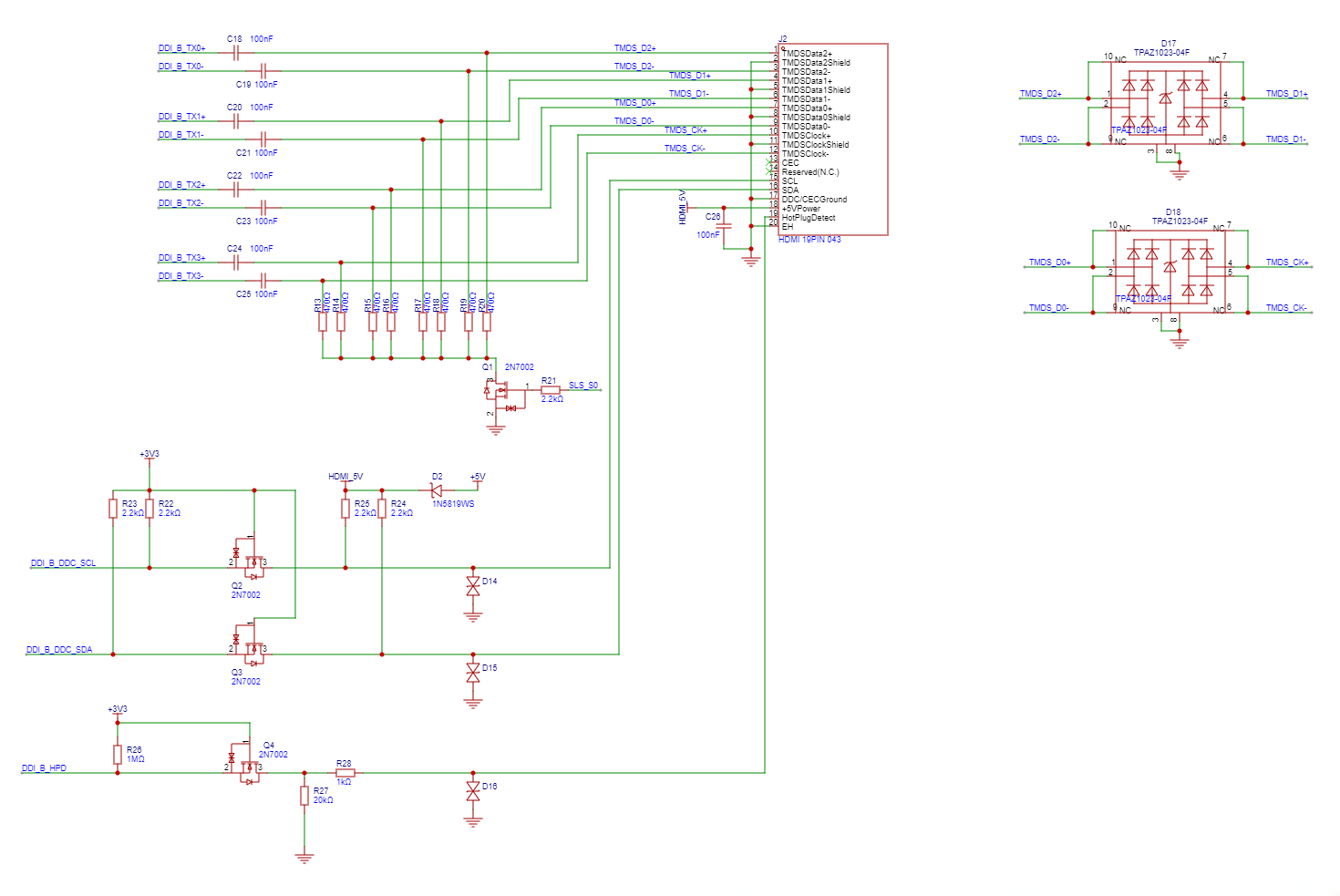所有TMDS差分信号线,均串有100nF的交流耦合电容(AC Coupling Capacitor ),并通过470Ω的电阻被NMOS可控的下拉到GND。