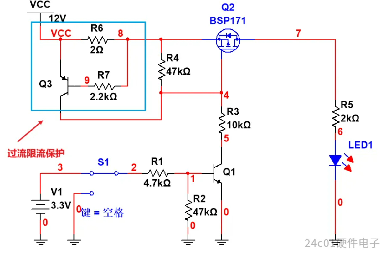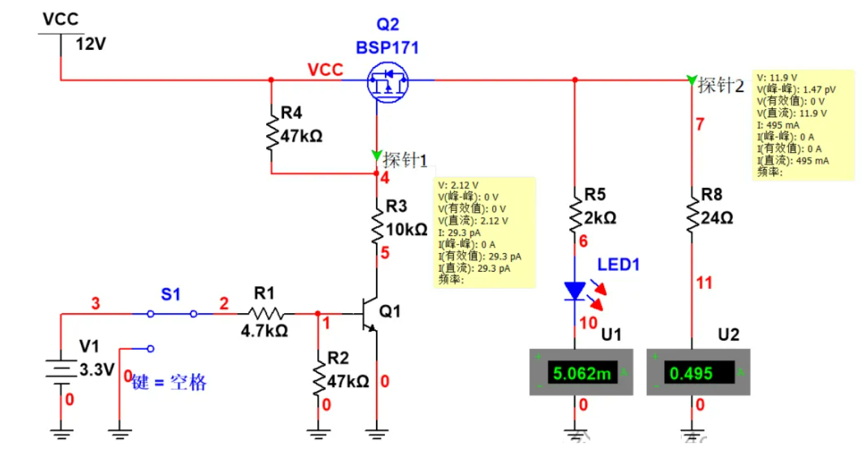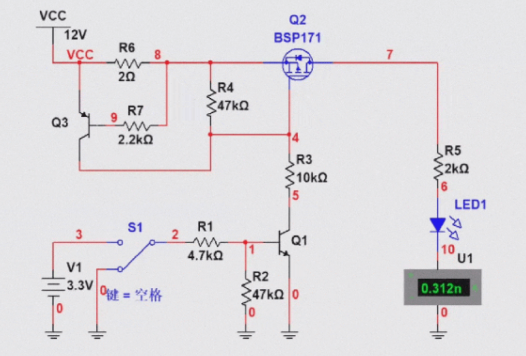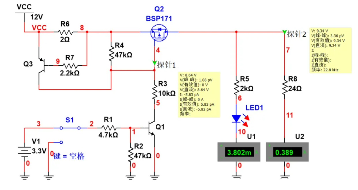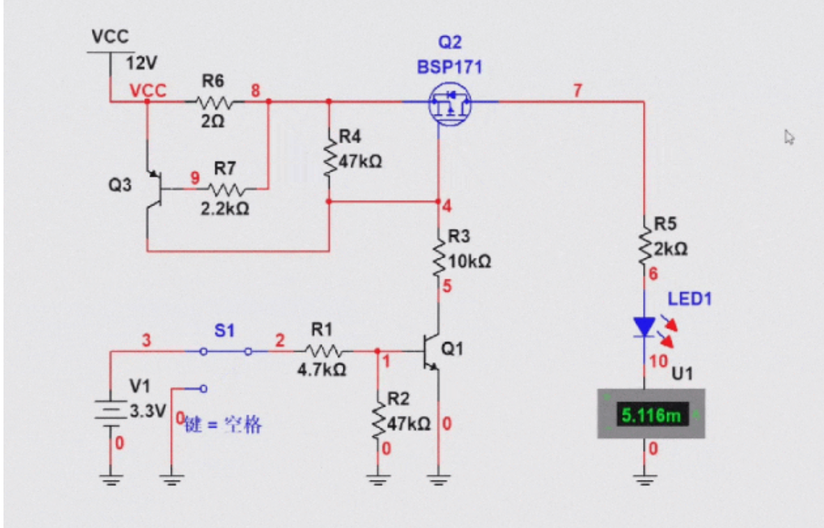 那么我们就对增加了过流限流的电路进行仿真,仿真结果如下,可以看到,当S1开关拨到3.3V时,此时Q1三极管导通,然后Q2导通,LED灯亮,此时由于负载电流为5mA左右,所以R6两端的压降为10mV左右,所以说Q3处于截止状态;