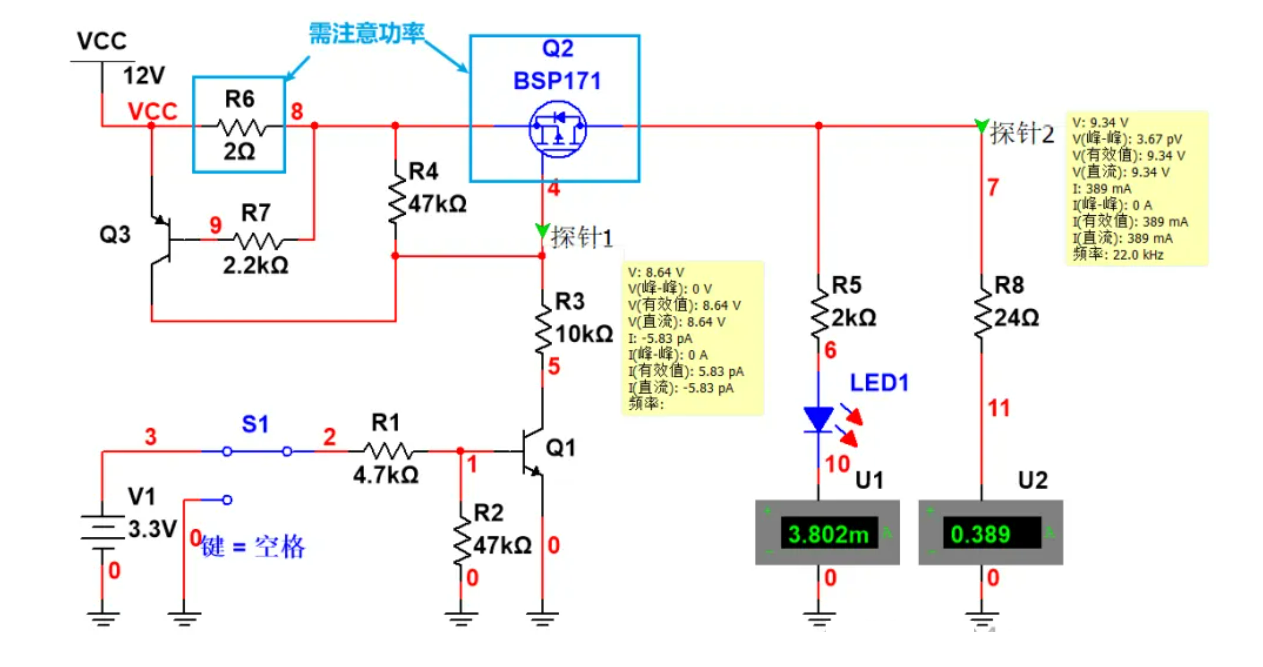 所以说, 这个电路也是一个过流限流保护电路,可以很好的保护前级电源,很经典,对三极管的使用很巧妙 。此电路设计时 需要注意电阻R6以及MOS管Q2的功率,否则如果负载加重的话,可能会导致Q2或者R6烧毁。 比如下图R6的功率为0.389*0.389*2≈0.3W。Q2的功率约等于(11.2-9.34)*0.39=0.72W。