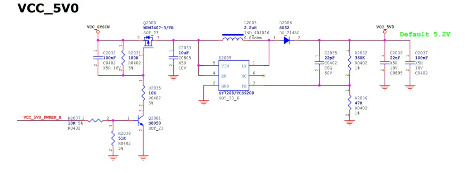 其实 这个电路也是对PMOS做负载开关的一个拓展电路 ,如果去掉上图的蓝色框内的三极管和电阻,那么我们的电路就和下图中 R K3588S中的PMOS做负载开关的电路 几乎一样了。下图截取自RK3588S的原理图DEMO板, 选型也供各位道友参考 :