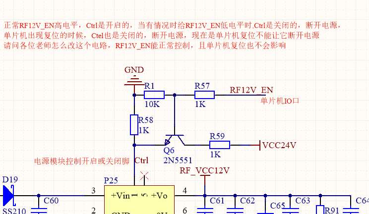 正常RF12V_EN高电平,Ctrl是开启的,当有情况时给RF12V_EN低电平时,Ctrl是关闭的,断开电源,单片机出现复位的时候,Ctel也是关闭的,断开电源,现在是单片机复位不能让它断开电源请问各位老师怎么改这个电路,RF12V EN能正常控制,且单片机复位也不会影响上拉电阻到单片机电源,那就RF12V-EN就用处不大了,但还是想RF12V-EN也可以控制,出现故障可以用RF12V-EN控制重启,这个怎么还用办法可以改吗?.....