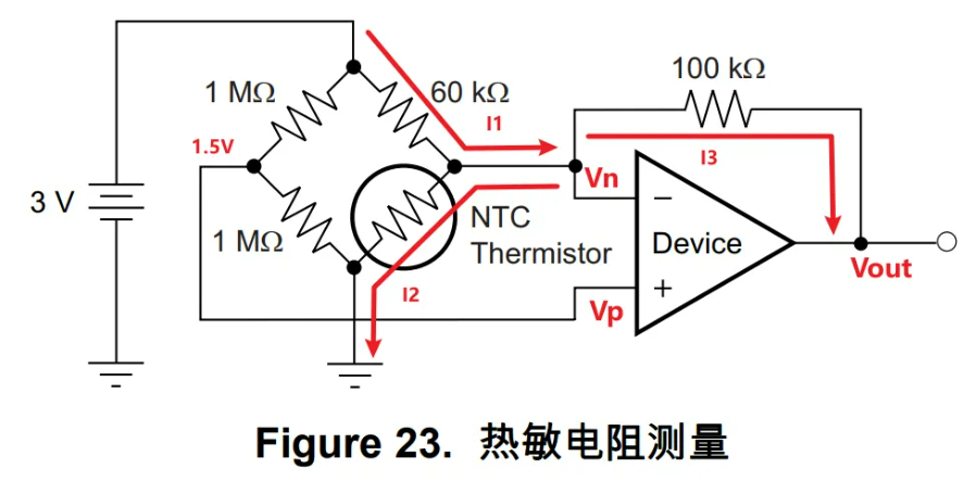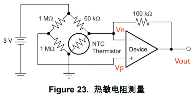 今天要分析的电路是一个 热敏电阻的检测电路 ,电路图选自 TLV333的数据手册 ,不过数据手册并未给出相应的输出电压公式,所以就将推导过程分享给各位道友: