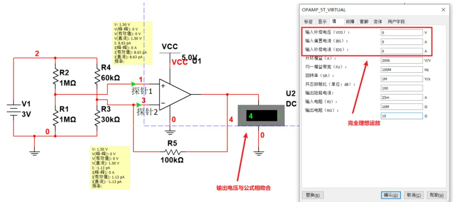 仿真验证可以看到仿真结果与计算公式相符合 ,不过这个是在完全理想的情况下,我已经将运算放大器的偏置电流,失调电压等参数均设为了0,实际应用是不可能做到这一点的。换而言之就是运放的失调电压以及失调电流均影响这个电路的输出精度: