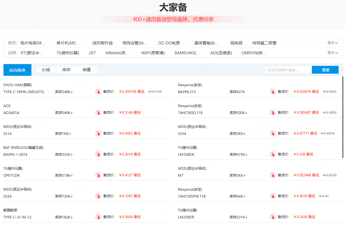 活动期间,400+通用大牌备货型号全线直降,还有立创专区限时特惠。优惠和返利优惠同享,备货更加实惠!