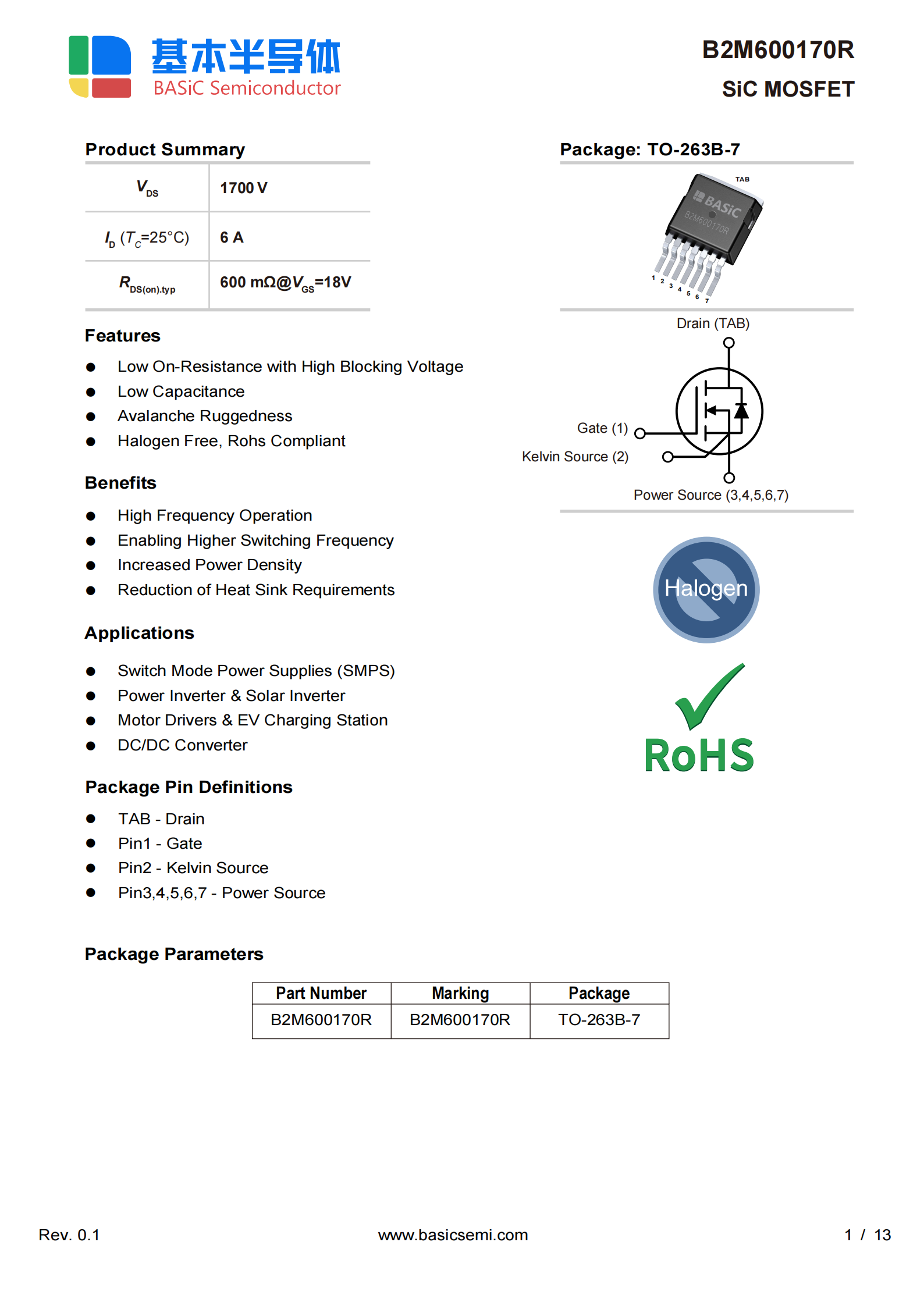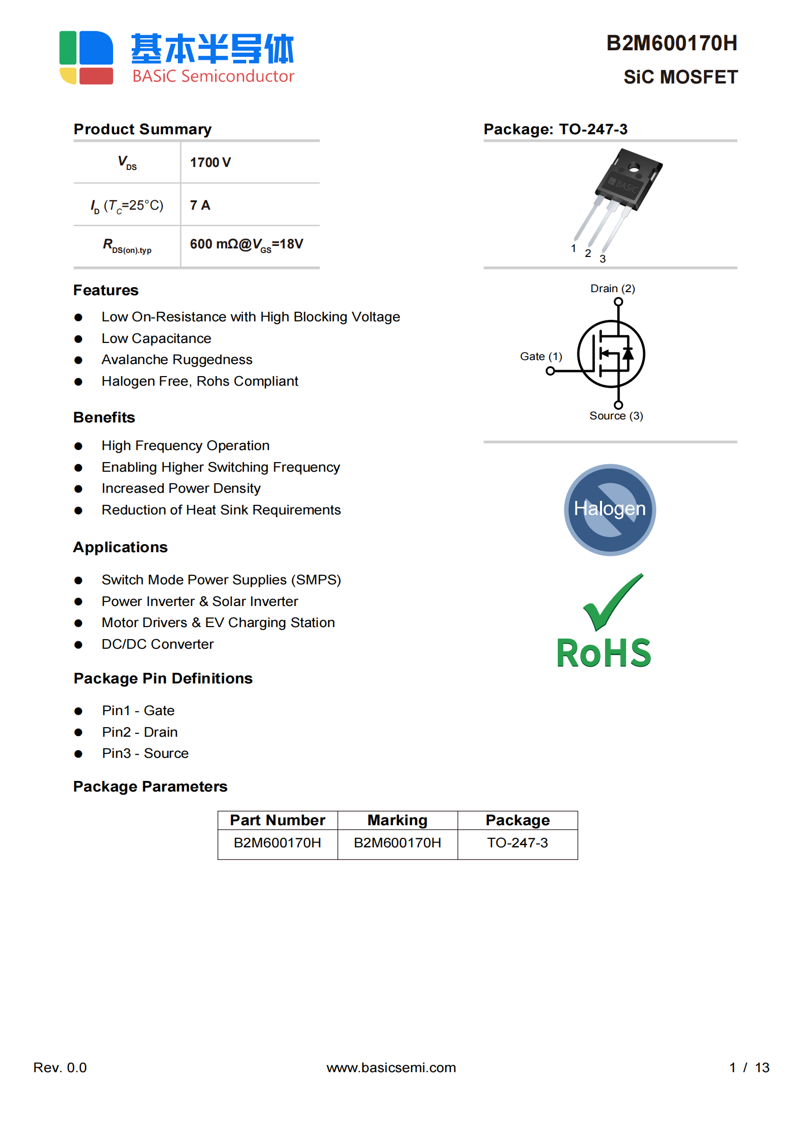 BASiC基本股份 B2M600170H:1700V耐压,7A连续电流(25℃),但碳化硅MOSFET R_DS(on)受驱动电压影响较大,也有贴片封装TO263-7的B2M600170R。