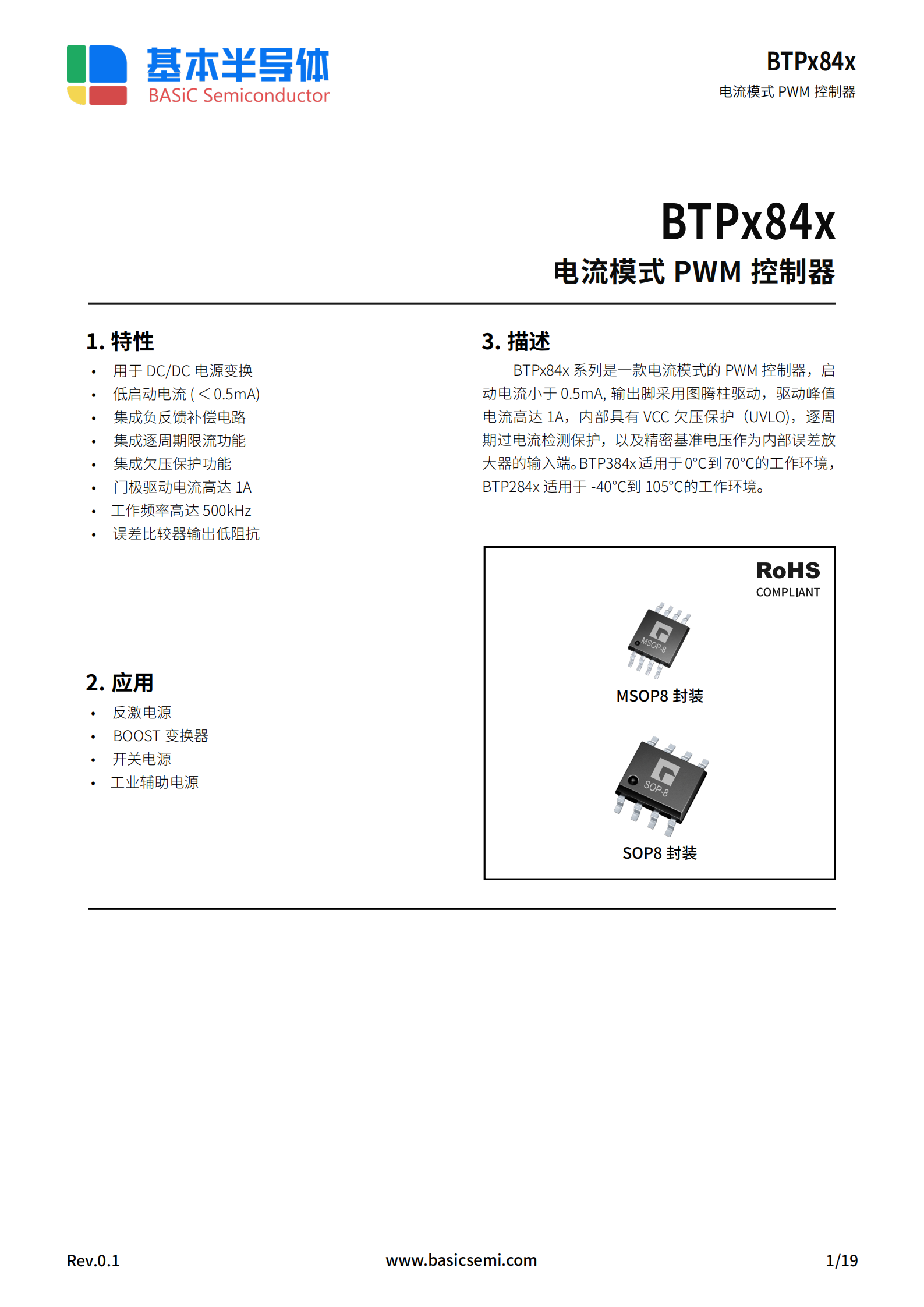 BASiC基本股份 BTP2843DR:最大占空比96%,开关频率≤500kHz,驱动电流1A。