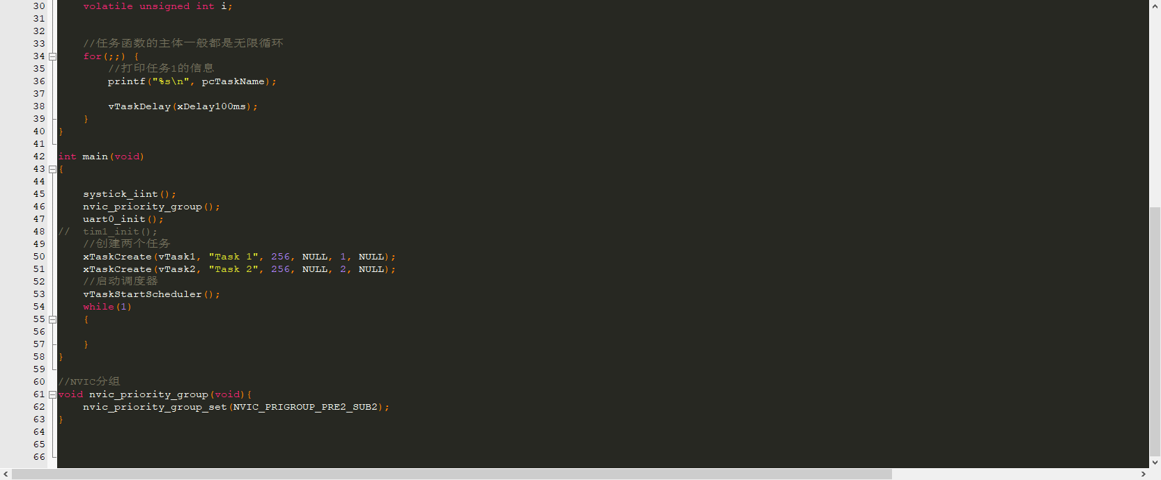 买的的梁上派的板子,将FreeRTOS移植到板子上面,成功编译无报错。然后创建了两个任务,但是只执行了一次,是哪里出错了嘛?