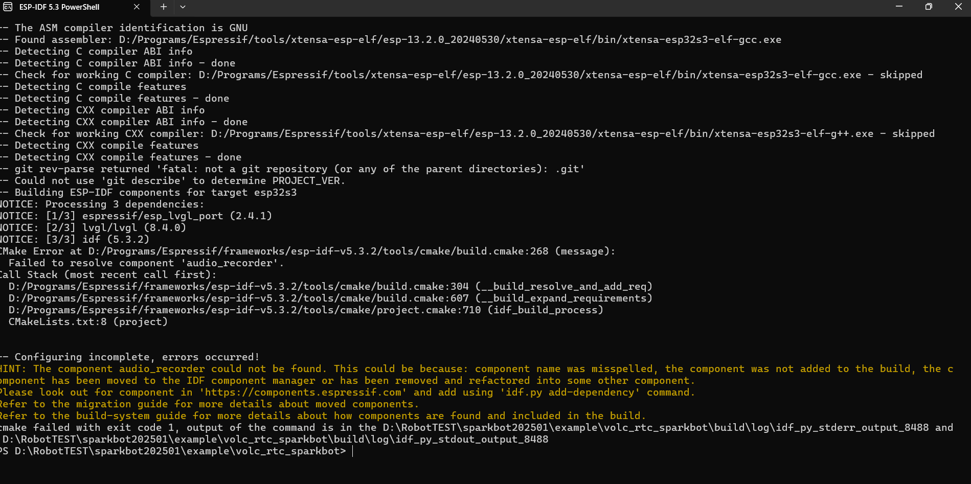 编译gitee上开源的esp接入豆包大模型的那个例程,volc_rtc_sparkbot,选择芯片(idf.py set-target esp32s3)的一步失败了,哪位知道是怎么回事吗?