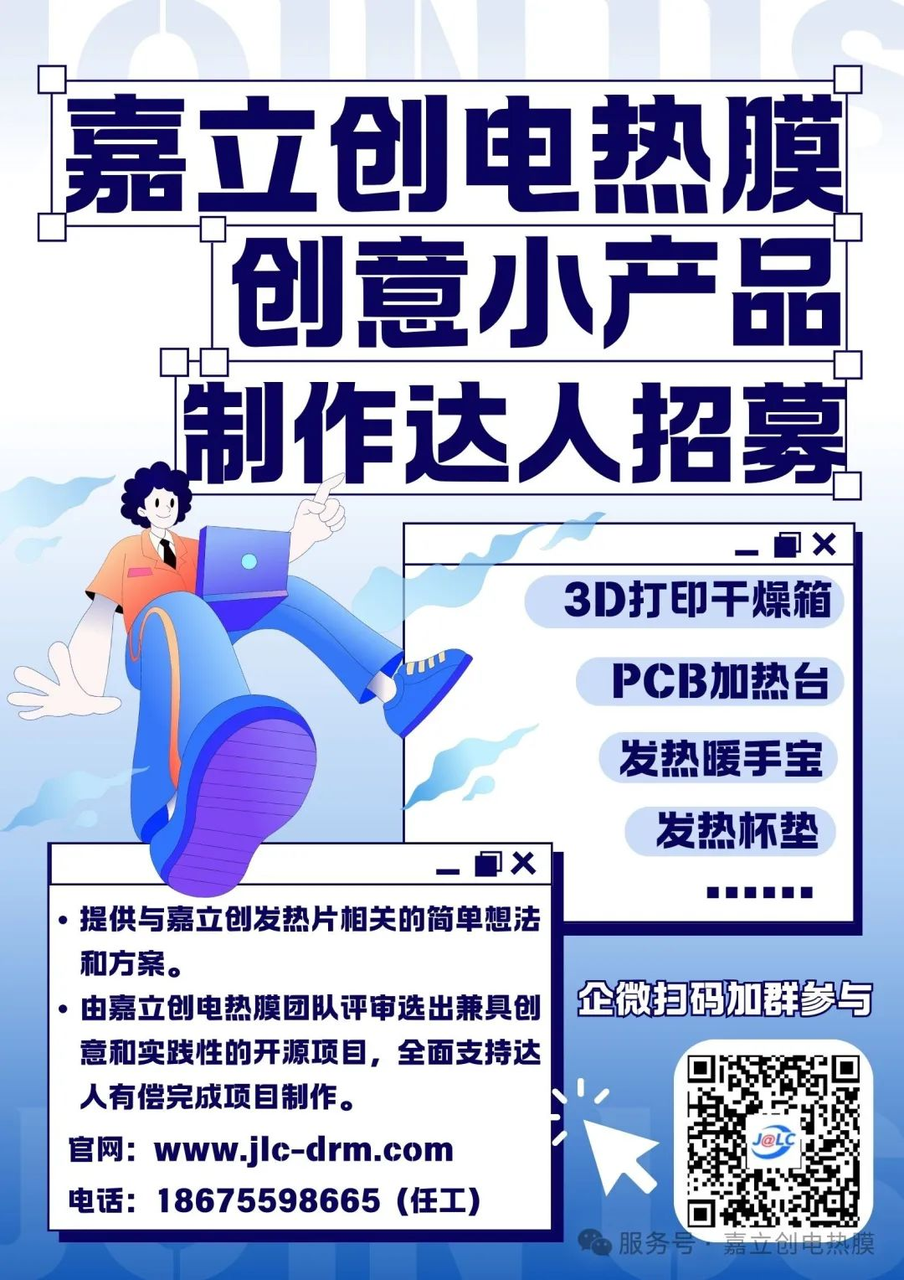 同时,我们也欢迎更多的电子工程师参与嘉立创电热膜相关的开源项目,我们会提供经费和耗材支持!走过路过不要错过哦!