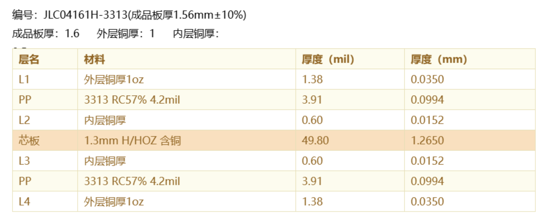 层压结构选择时根据项目与实际要求选择合适的层压结构本处使用JLC04161H-3313(成品板厚1.56mm±10%)层压结构具体如上图所示,