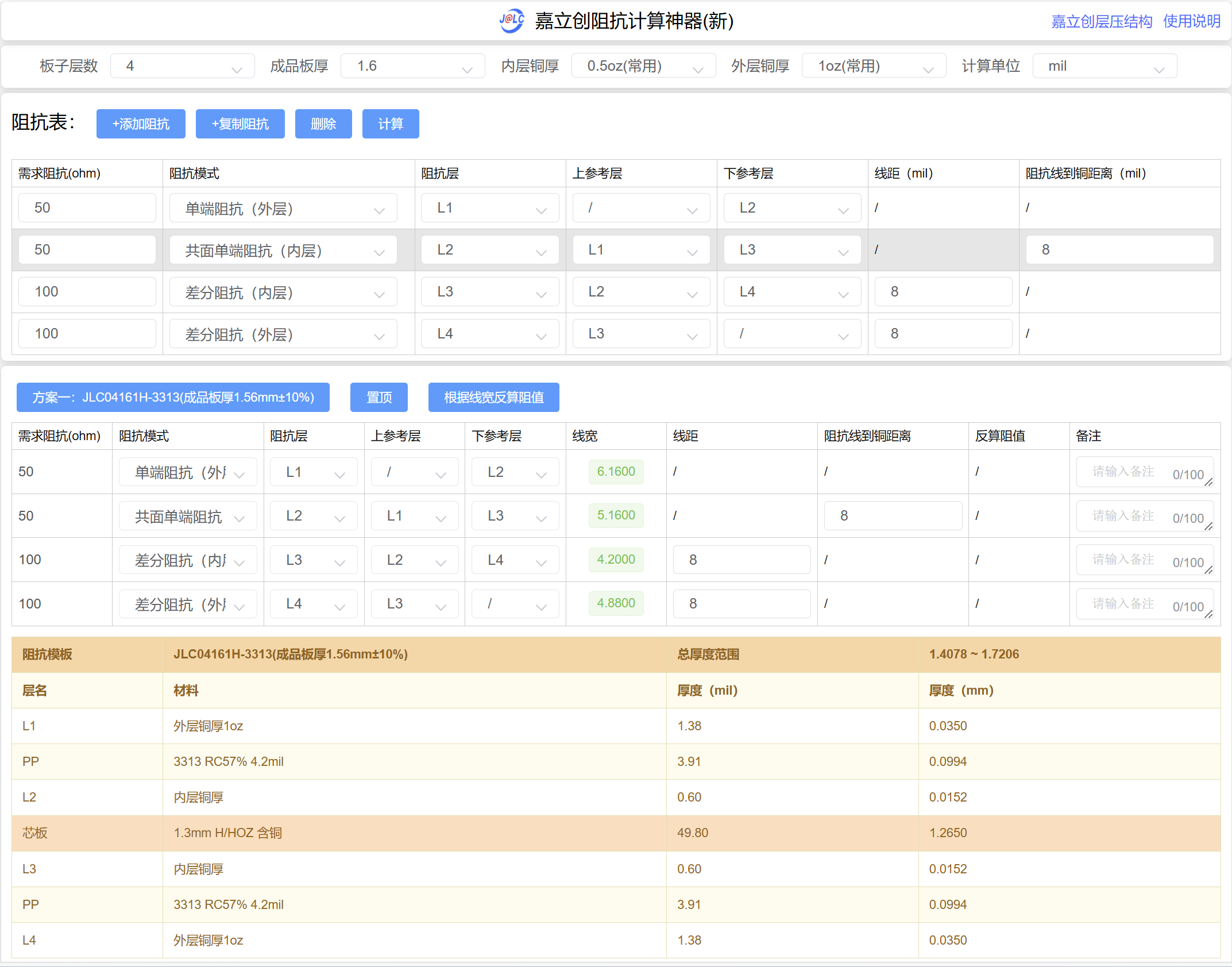 阻抗匹配计算此处使用嘉立创阻抗匹配神器进行计算选择在阻抗匹配神器中添加阻抗选择PCB具体阻抗模式、阻抗值、阻抗层即可进行相对应计算根据不用的阻抗值、阻抗模式可计算得出具体阻抗层之上的所需线宽,进行相对应使用设置PCB绘制规则。