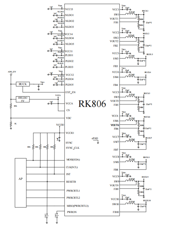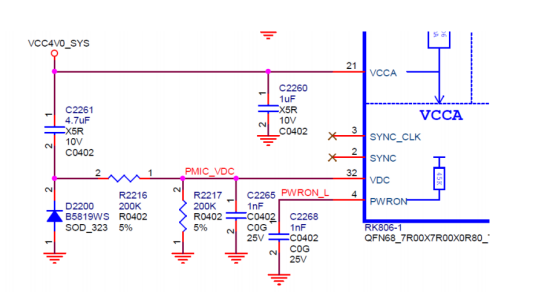 4.pin32(VDC)引脚:VDC 引脚用于外接电源自动开机。该引脚的识别高电平为 0.8V,推荐电压大于 1V 且小于等于 VCCA 电压。当满足 VCCA、VCC1、VCC2 大于 3.0V 的条件时,如果 VDC 检测到高电平,RK806 就会开机,并且在 VDC 为高电平期间,RK806 不能被关机。若要实现插适配器开机功能,需要给 VDC 脚做 RC 延时(可根据实际情况插入相应的 RC 延时电路图,便于理解其实现方式)。