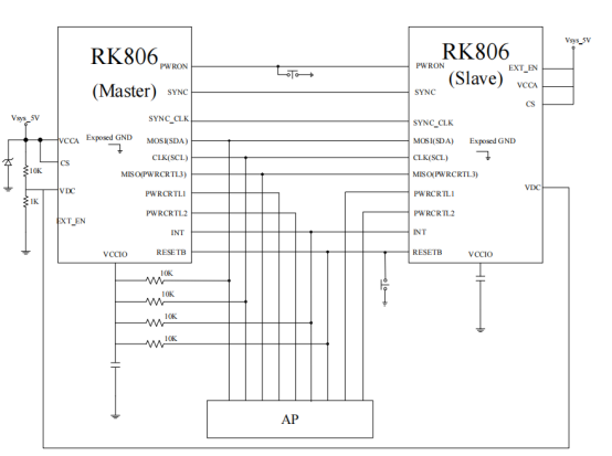 1.主从模式设置:将其中一颗芯片设为主芯片,设置方式为使 EXT_EN 不接高电平(可悬空或连接外部 BUCK 的 EN 脚);另一颗设为从芯片,通过将 EXT_EN 短接到 VCCA 来识别。使用时,需将两颗 PMIC 的 VDC、PWRON、RESET 短接在一起,确保信号同步。