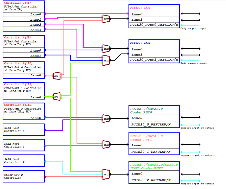 · pcie3.0PHY:含 2 个 Port 共 4 个 Lane,这 4Lane 可根据实际需求拆分使用,拆分后需在 DTS 中合理配置对应的控制器,无需修改驱动。