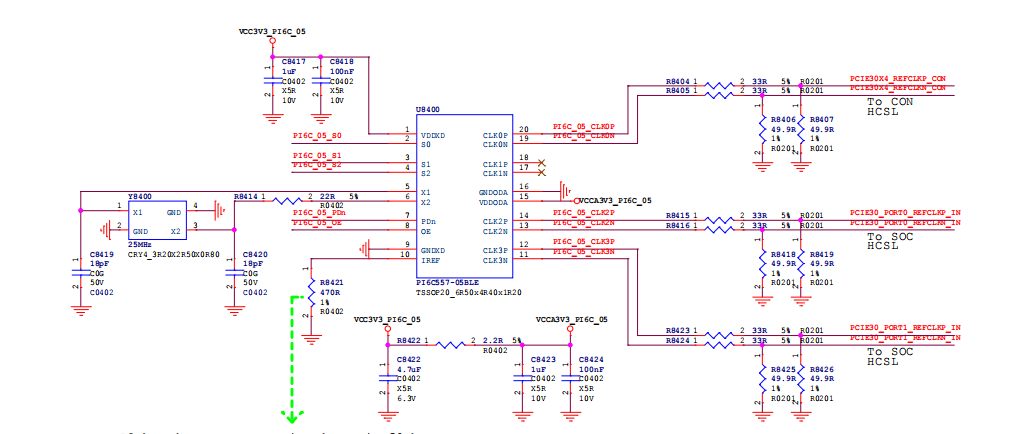 从时钟缓冲器输出的信号线路上可以看到多个串联和并联的电阻(如R8406 - R8409、R8415 - R8418等)。这些电阻主要用于信号的阻抗匹配,减少信号在传输过程中的反射和损耗,确保信号能够准确、稳定地传输到目标电路(如标注为“TO_SOC_RCCSL”等的模块)。