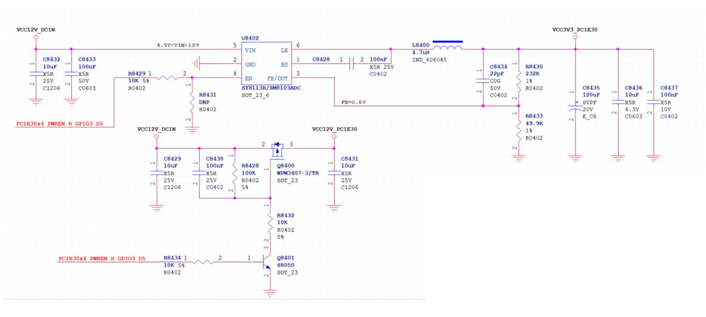 · 电源转换芯片:U8402(型号为 SY8113B/SM8103ADC,封装 SOT_23_6 )是电源转换芯片。其引脚 5(VIN)连接输入电源,在 4.5V - 18V 输入电压范围内工作。芯片通过内部电路将输入电压转换,引脚 3(FB/OUT)为反馈与输出引脚,通过连接外围电阻 R8430(232KΩ,精度 1%)和 R8433(49.9KΩ,精度 1%)来设定输出电压。根据公式计算(假设反馈电压 FB = 0.6V ),输出电压 Vout = 0.6V×(1 + R8430/R8433)≈3.3V,即转换为 VCC3V3_PCIE30 的 3.3V 输出,为 PCIe3.0 设备供电。引脚 6(LX)通过连接电感 L8400(4.7μH)和电容 C8428(100nF,耐压 25V)等组成的 LC 滤波电路,进一步稳定输出电压。