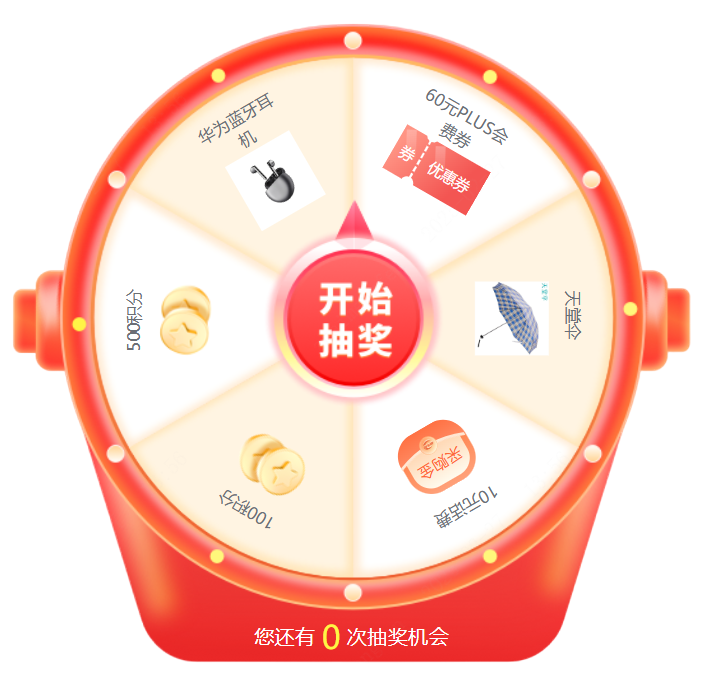 3月7日正式开启的超级大转盘礼品将更丰富,当天下单就可获得抽奖机会,幸运锦鲤有机会抽到华为耳机!奖池含华为耳机、天堂伞、10元话费、60元PLUS会费券、积分等。复制链接邀请好友下单并支付,邀请人可再获得1次抽奖机会,最多可邀请5位好友。