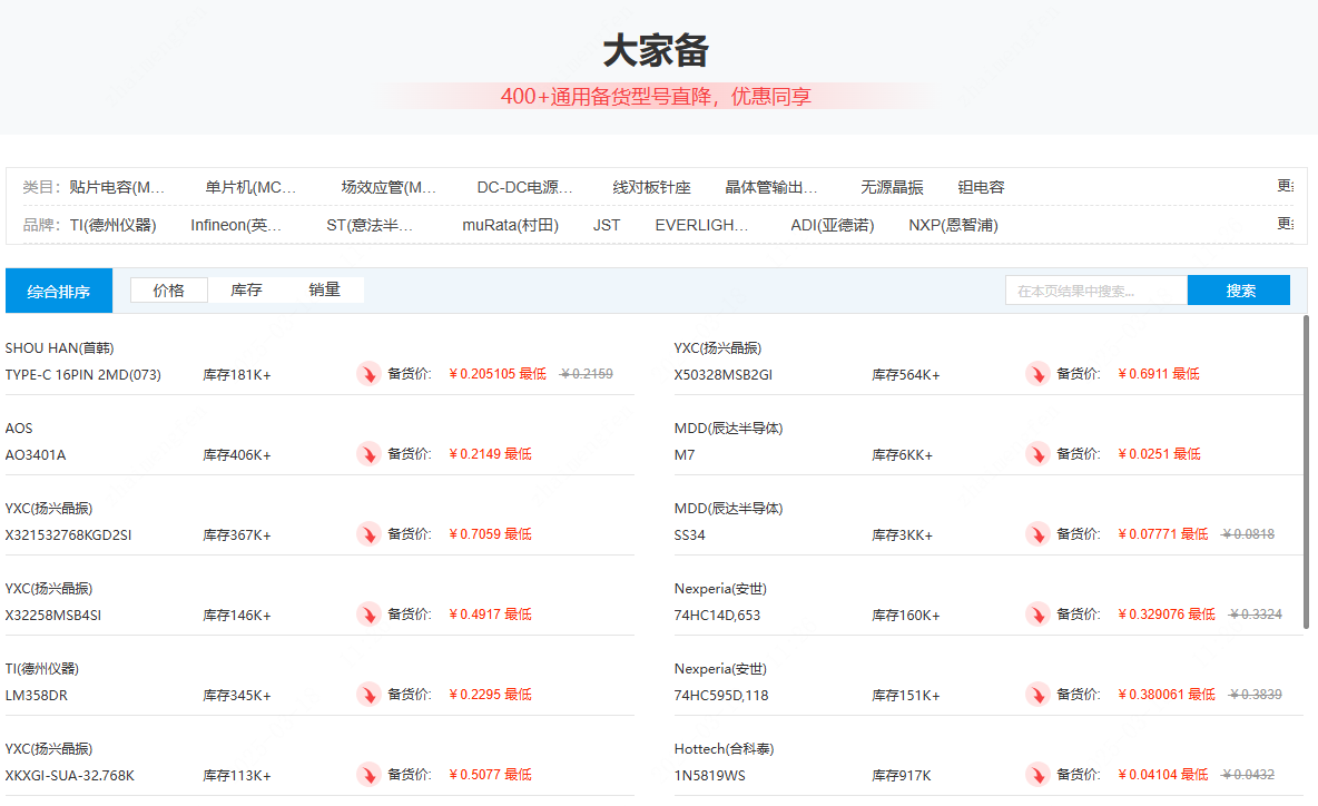 活动期间,400+通用大牌备货型号全线直降,还有立创专区限时特惠。优惠和返利优惠同享,备货更加实惠!