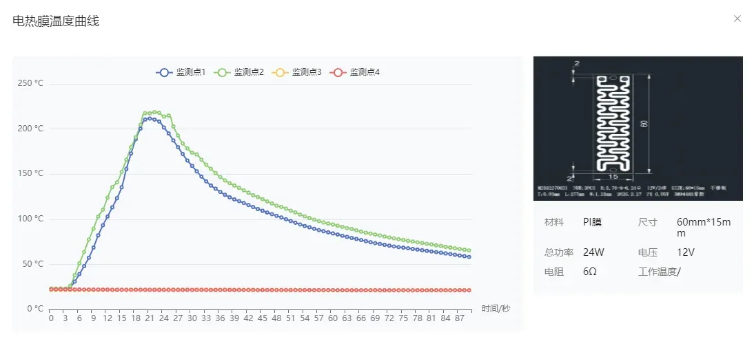 那么成品 PTC 热片呢?一样的,只能按照它有的外形去设计,虽然性能不错,但是它的功率要求不是一般的大,只有达到冲击功率后,慢慢降到稳态功率才能正常工作。而冲击功率往往都是100W以上。这个时候就到我们的最佳选择上场了--嘉立创电热膜!