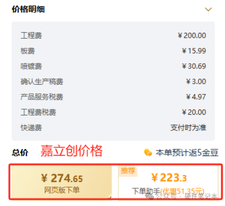 嘉立创总价274.65元,可以看到各项价格计算很细,用下单助手下单优惠51.35元,只需支付223.3元。