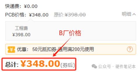 B厂总价398元,我个人有50元的优惠券,券后价348元。
