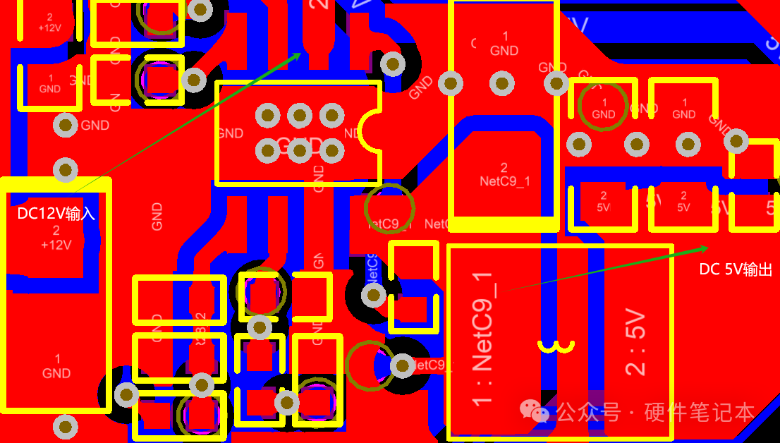 小小的过孔看起来不起眼,实则很有讲究,新手最容易翻车。之前,一个新同事在画DC/DC电源的时候,因为过孔没打好,板子回来调试发现电源带不起载,后来只有重新画板,如下是更新后的PCB图,一个12V转5V的DC/DC电源。