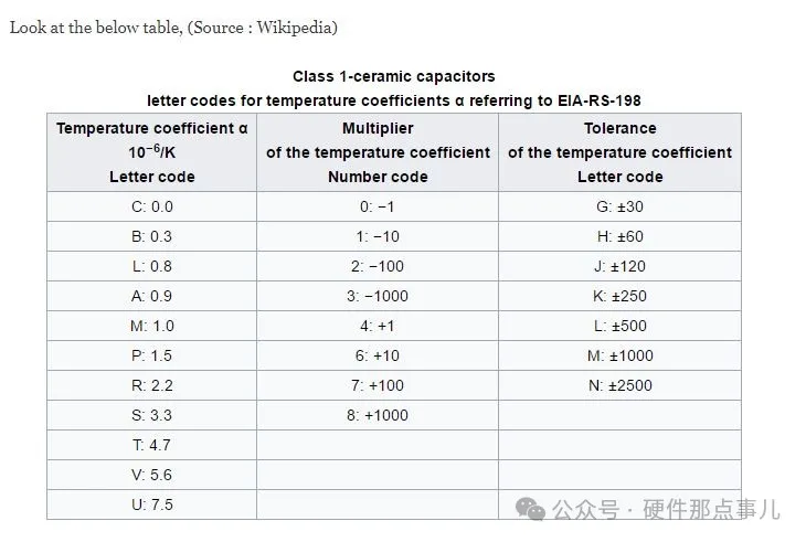 I类电容的编码规则如下,编码中第一个字母代表电容的温度系数,单位为ppm/K,第二个数字代表温度系数的乘数,第三个字母代表电容温度系数的误差,单位为ppm/K。我们接触最多的I电介质的电容就是C0G了,当然它还有个名字叫NP0,NP0和C0G的同一等级的电容类型,NP0是IEC/EN 60384-1标准中规定的代号。