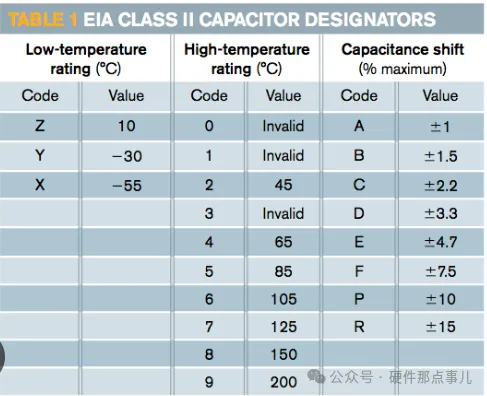 II类电介质的分解方式与I类电介质不同,根据EIA ES-198标准,根据温度范围内电容的变化,第一个字母代表电容的最低工作温度,第二个数字代表电容的最高工作温度,最后一个字母代表对应温度范围内的电容精度,