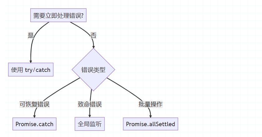 - 推荐:90% 的场景下需要捕获错误,因此 `try/catch` 是最直接的错误处理方式。