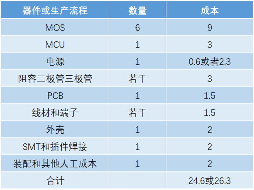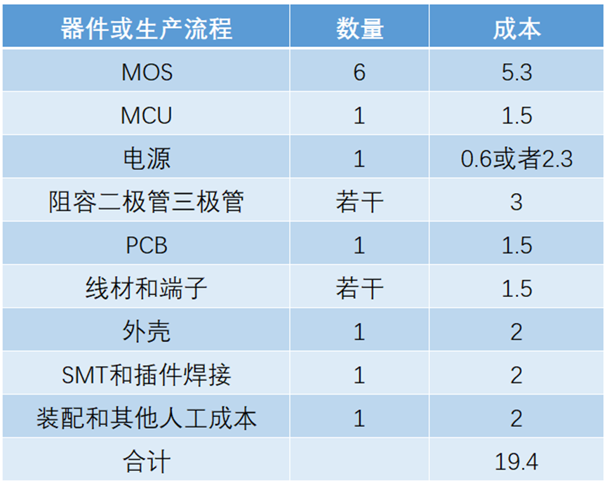 除了电机驱动、MCU、电源之外,应该就没啥大件东西了,调速、油门、刹车、霍尔信号等等一大堆输入输出只需要几个电阻电容差不多就搞定了,如果搞不定,那就再加几个二极管三极管。既然是电机驱动板,那么肯定有一个电流采样电阻,还有几个大的储能电容。另外,电路板和外壳、线材还有装配的人工成本,SMT的成本都要算上