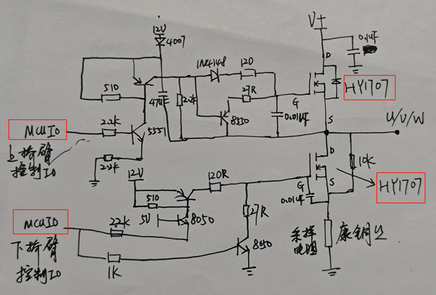 上图中框起来的是其中的一个相线的控制,两个MOS管组成了上下桥臂,三路桥臂的下端汇流到一起之后通过采样电阻到地,采样电阻用的是康铜丝的。MOS的驱动电路和我猜的没错, 用的是二极管三极管加阻容实现的,这一块电路比较熟悉,我直接把原理图画出来,当然也参考了一本十年前的书籍: