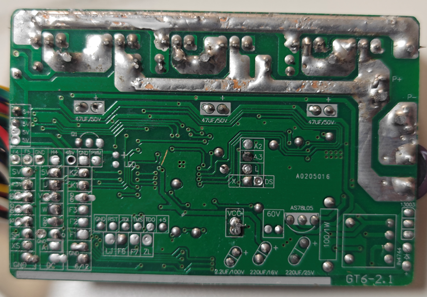背面只有走线,在三个桥臂的供电和地的回路上,做了开窗加锡的操作,这是常规操作了,电流不够,锡坨来凑嘛。