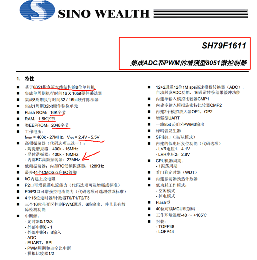 另外,这个MCU内部RC高频振荡器可以做大27MHz,这也就是为啥在板子上看不到晶振的原因,应该是直接使用了内部这个RC高频振荡器。