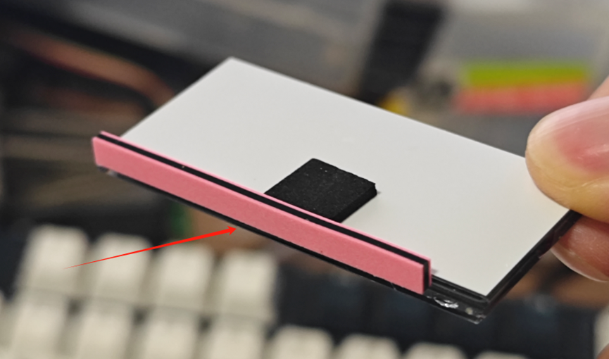 刚刚说的屏幕接口“银手指”是另外一个这种廉价电子产品的显示屏接口常见的东西。屏幕和PCB上的“银手指”通过上图的粉红色的东西连接。这个东西我小时候从电子手表里也拆出来过,拿在手里软软的手感很不错哦。这个东西叫啥名字我也不知道,我做电路设计没用过这东西,有前辈知道的话可以告诉我一下。