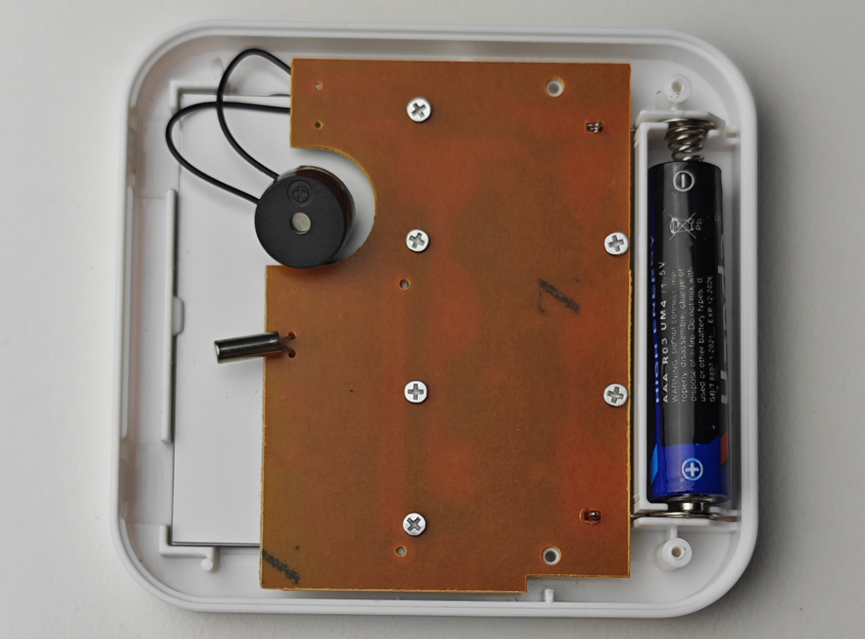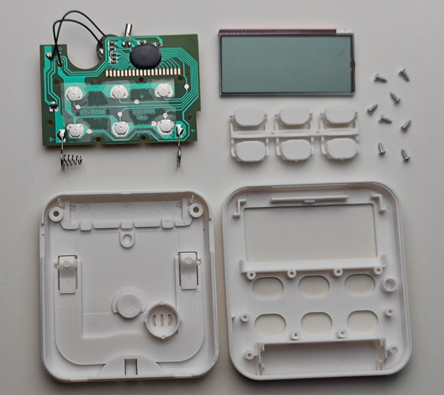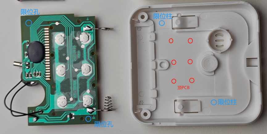其实看看全家福,结合之前的照片大概能猜到为啥固定PCB用了6颗螺丝,是因为闹钟正面是六个按键,为了让按键按下去的时候板子不凹进去,所以在按键周围通过一圈螺丝来固定PCB。但是六个螺丝的话装配起来是不是比较慢呢?能否改成无螺丝的PCB安装设计呢?