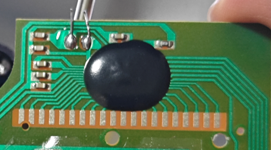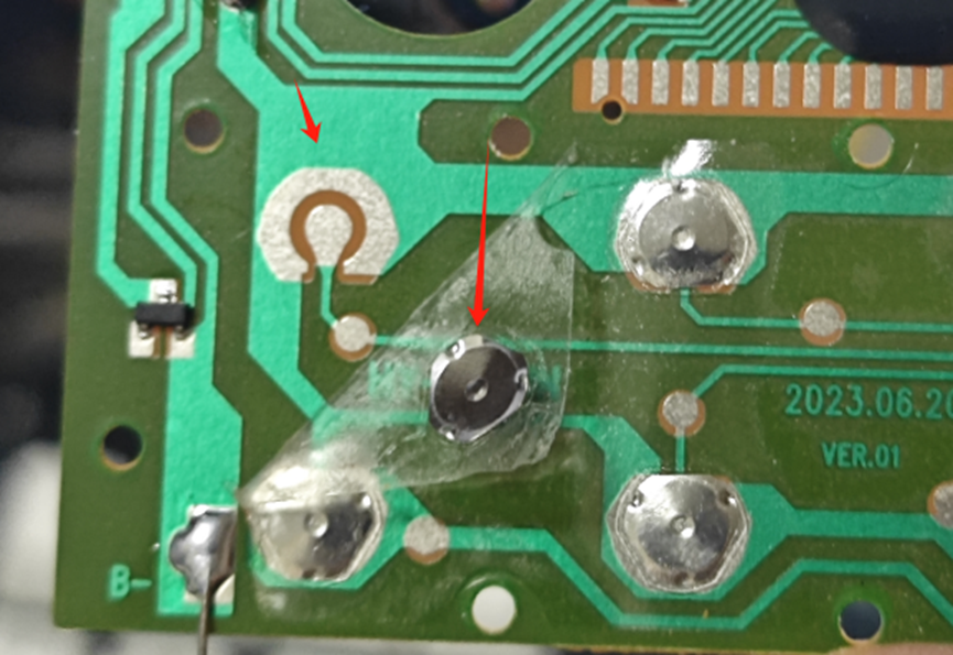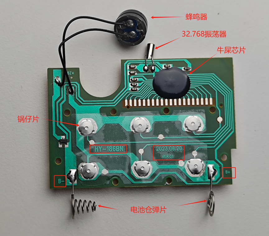 PCB是单面板。电池仓弹片是直接焊接在PCB是上的。还贴心的在两个弹片的焊点上放了B+和B-,字是放在etch层的而不是silk层。上面六个锅仔片是按键,一般白色家电、一些低端的电子产品里都会用这种东西。在上面是屏幕接口“银手指”,这个等下说。屏幕接口“银手指”上面黑色的一坨就是牛屎芯片。