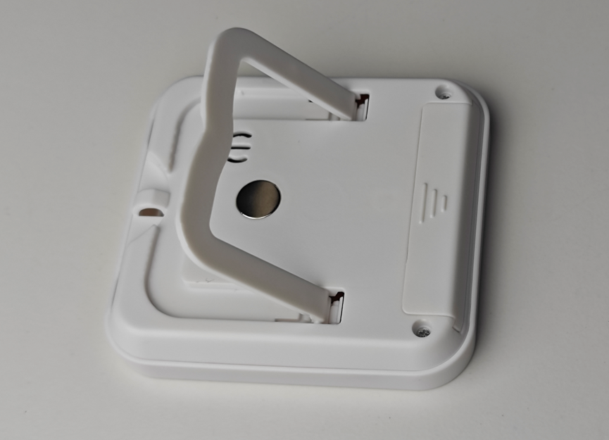背面有一个嵌入的圆形磁铁,可以直接把这个闹钟吸在一些铁的物体上面,这个设计初衷不错,但是我找了一遍家里似乎没啥东西是铁的平面,除了入户门,所以似乎不是很实用。