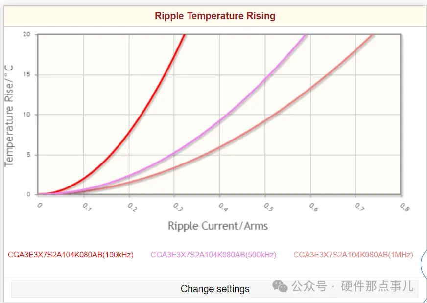 关于第二个问题单个电容能承受多大的纹波电流呢?电容规格书中会提供温升-纹波电流曲线,直接读图就能基于纹波电流的大小评估出电容的温升。